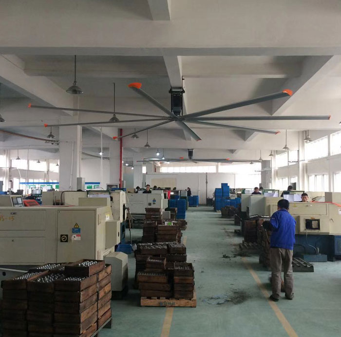 我公司生產的大型工業吊扇直接懸掛在廠房屋梁下,風力柔和,能加快車間空氣流通,有效降低車間內溫度,改善車間空氣環境質量,有利于員工的身體健康。